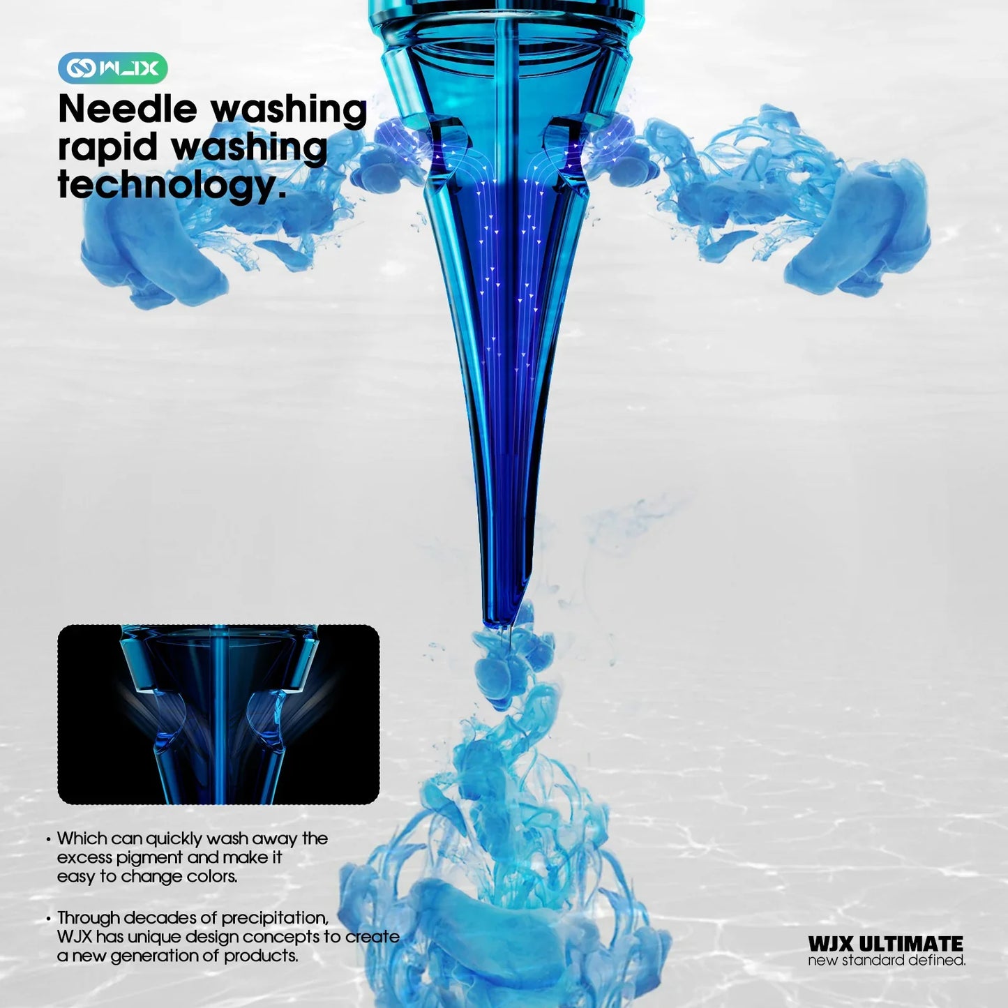 The tip has two holes based on aerodynamics. These holes create a powerful spiral that quickly washes away excess ink. This advanced system makes it easy and comfortable to clean the tip and needle.