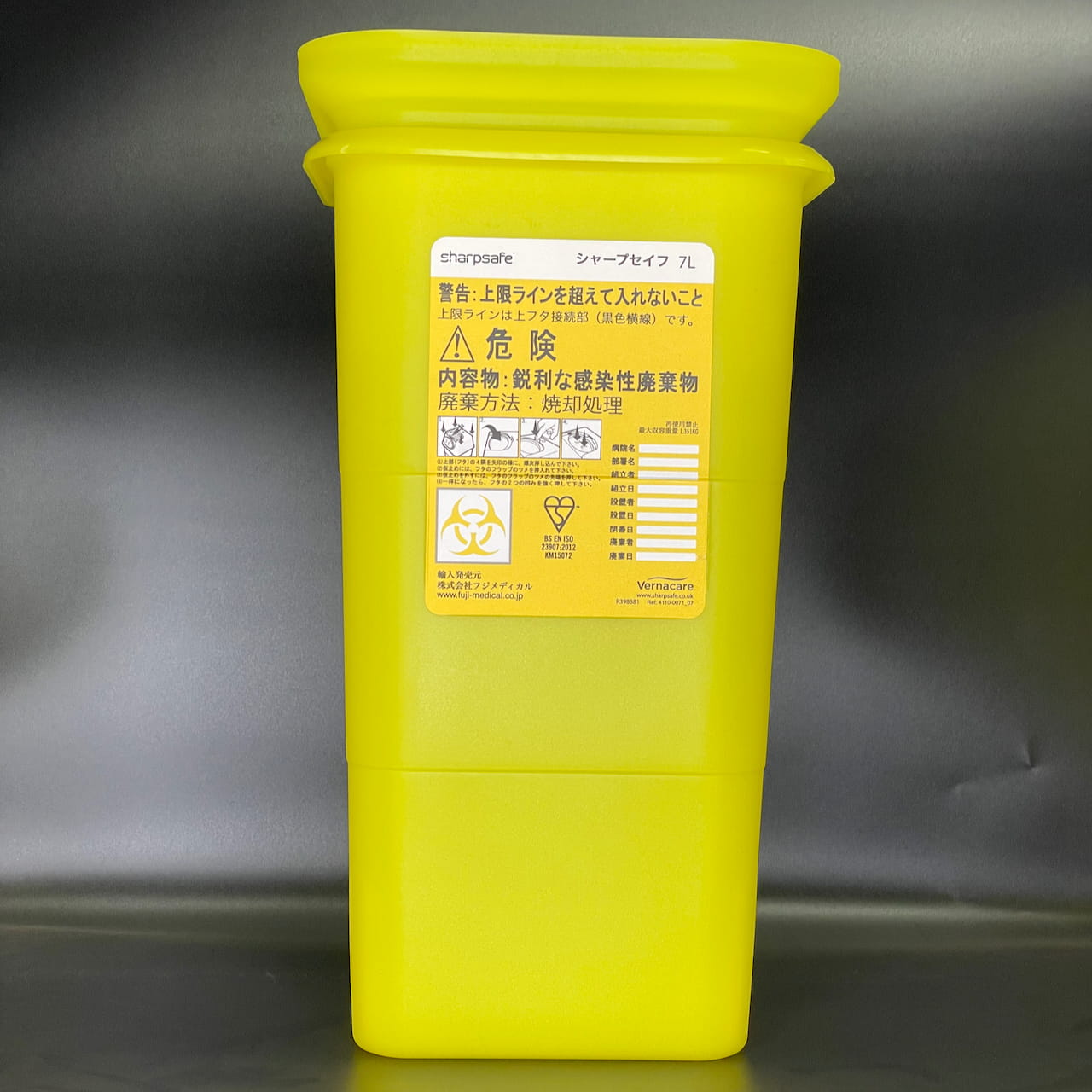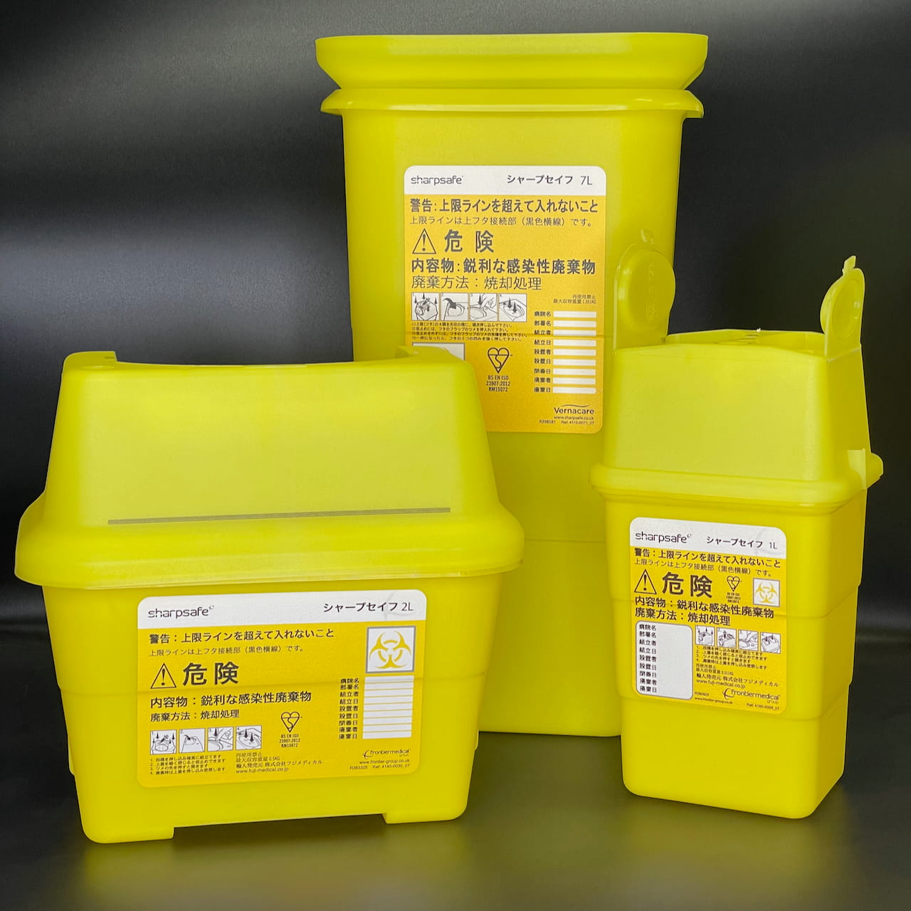 使用済みニードルなど、感染性廃棄物(かんせんせい はいきぶつ)を安全に保管・廃棄する、国際安全基準に対応した専用容器です。