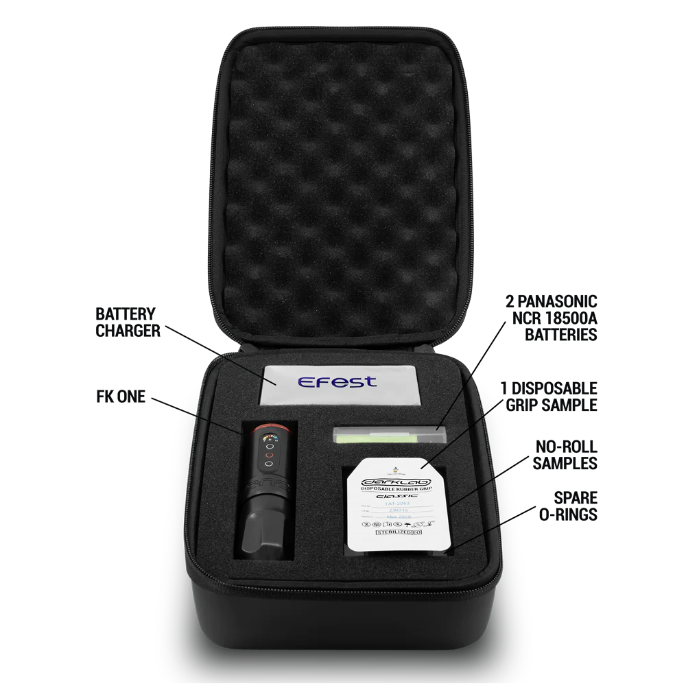 FK Irons ONEは、普段使いからコンベンションに便利な誰にでも使いやすい、シンプルな設計のペン型ワイアレスマシンです。マシン本体の他に、最小限必要な付属品がセットになっています。