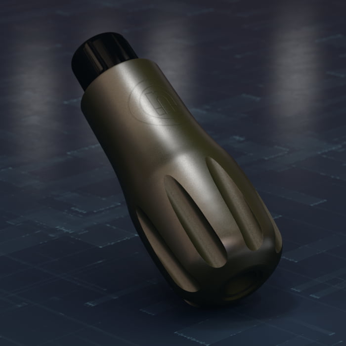 デザイン設計は、小型でバランスのとれたシステムを基盤とし、出力を最大化することに重点をおいています。重心をニードル側に近づけることで手の負担を軽減し、快適なタトゥーイングをサポートします。針調節は上部にあるノブでを回転して調整します。グリップはマシンの全体をカバーするように設計され、クロスコンタミネーション(交叉汚染)を防ぐ役割もあります。マシンはシンプルな構造なのでバリアも簡単です。グリップの素材は、表面にアルマイト処理をしたアルミニウム、およびステンレスなのでオートクレーブや低温殺菌が可能。衛生環境にも最大限に配慮されています。