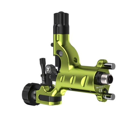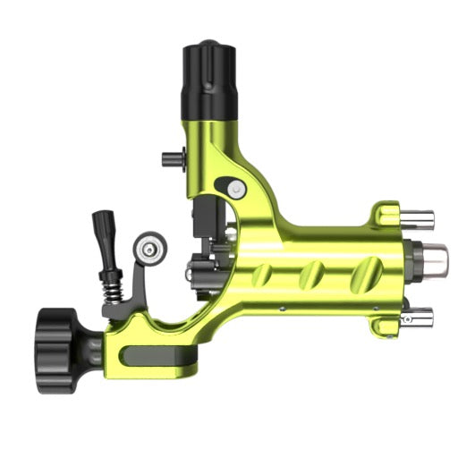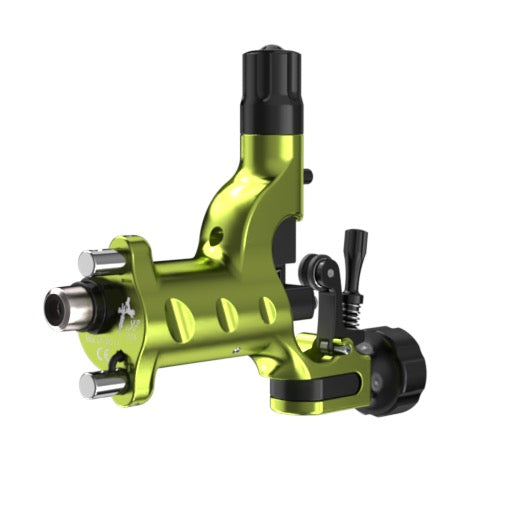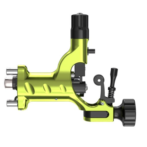 電源には、RCAケーブルとクリップコードの両方を備え、インクマシーンズ社のパワーサプライRPS-600を装着すればワイアレスマシンにもなります。また、昔ながらのグリップ、チューブ、ニードルを使用できますが、カートリッジニードルにも簡単に変更することができます。カートリッジ使用時は、モーターに負担がかからないよう、ステイアップ・スプリングを取り外してください。